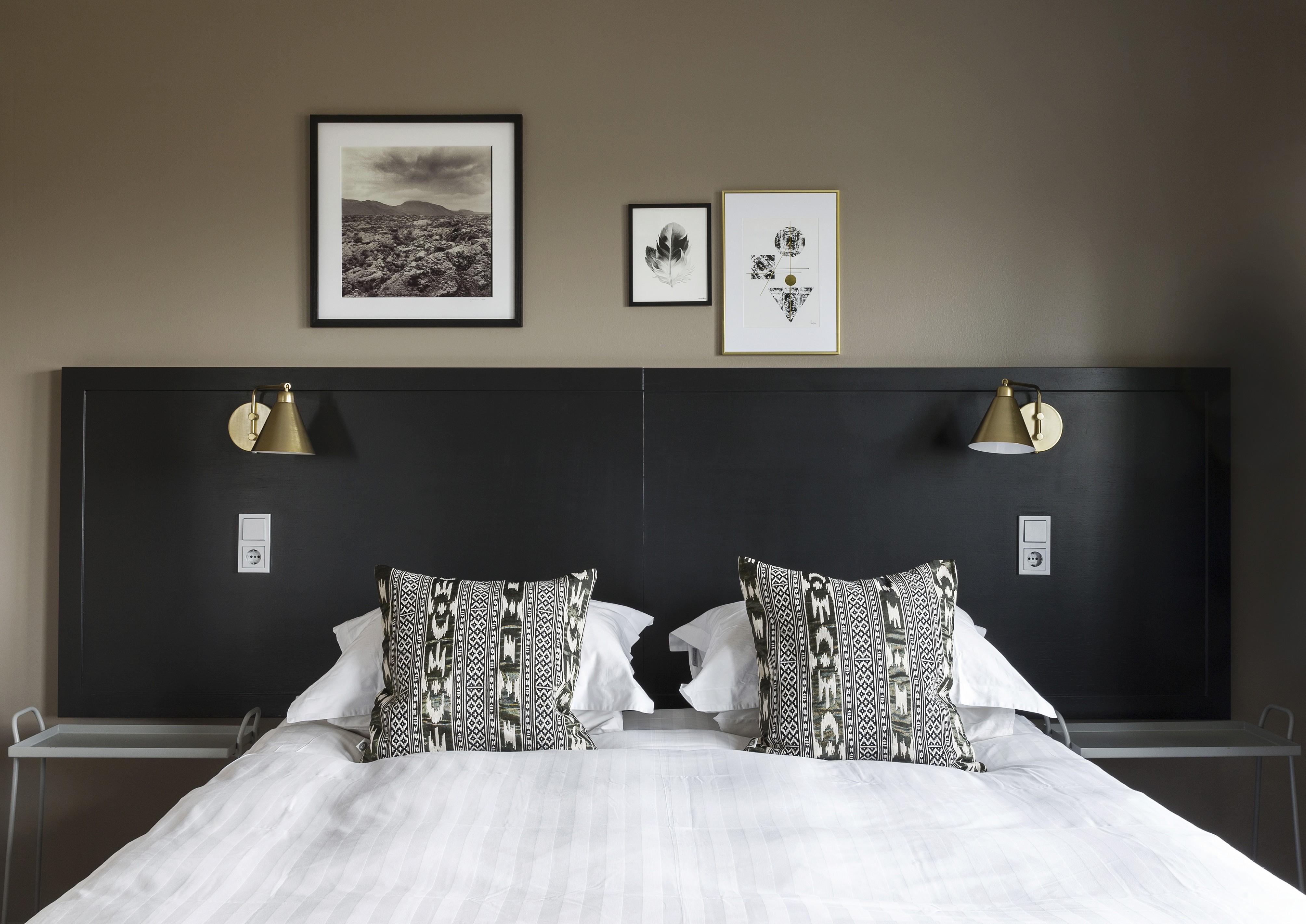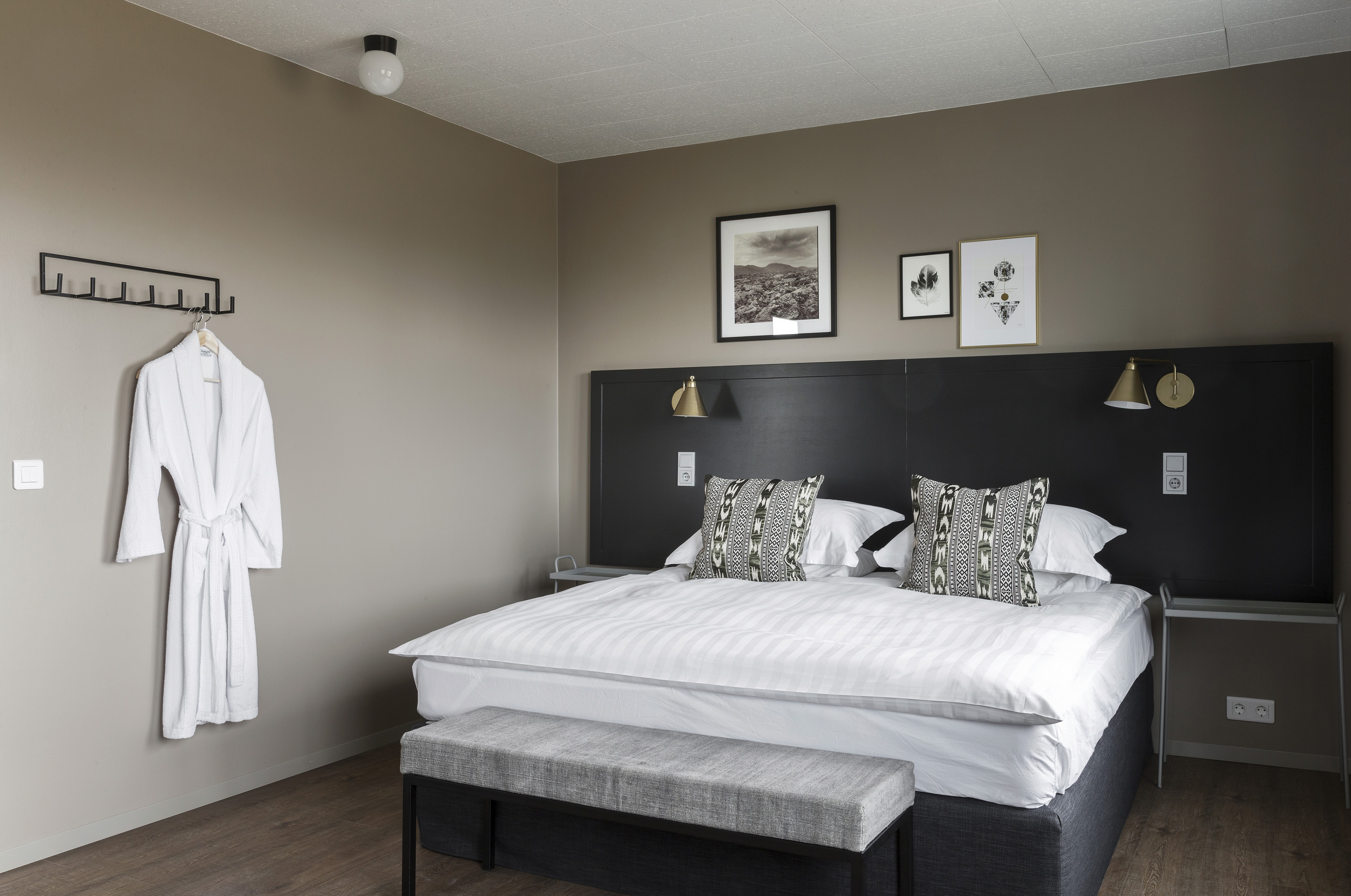 A larger, comfortable room in the main building with a double bed, cosy bedding, and views of the surrounding mountains, offering a bit more space to unwind after a day of adventure, along with modern amenities and bathroom products from Sóley Organics.